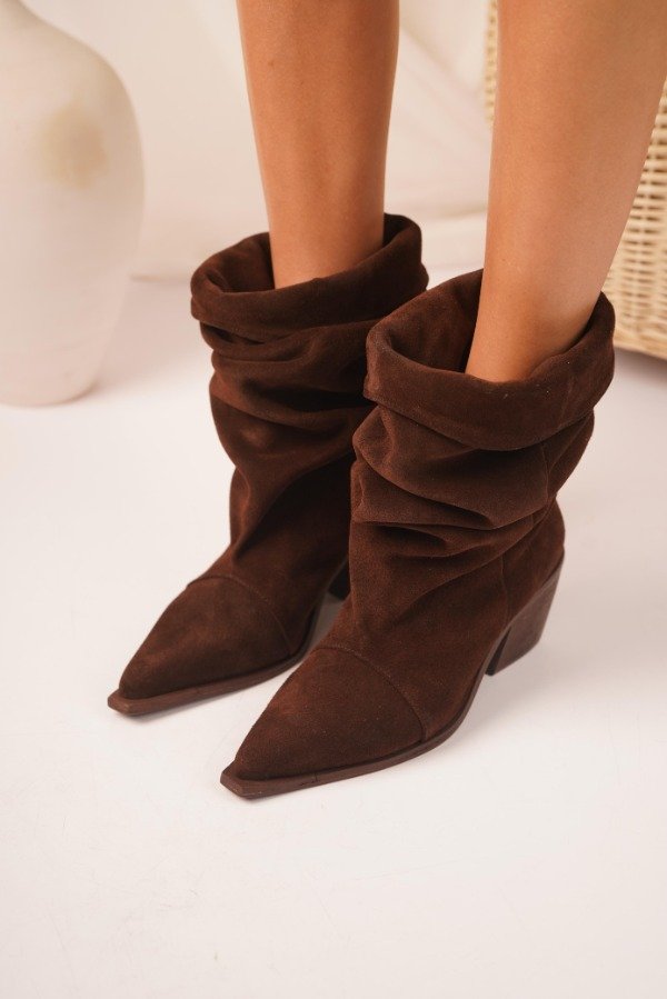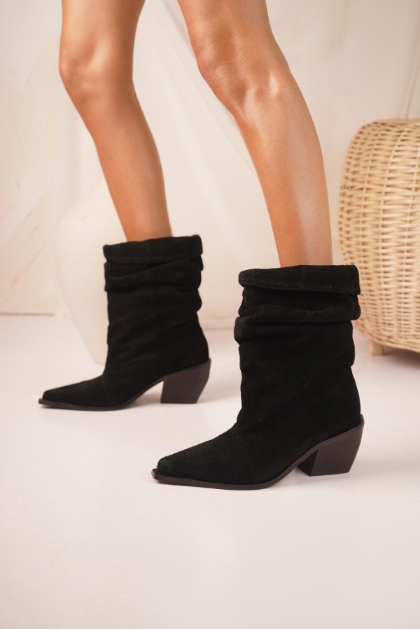 Texanas de cuero gamuzado, taco de 7 CM, base artesanal. Detalle abuchonada